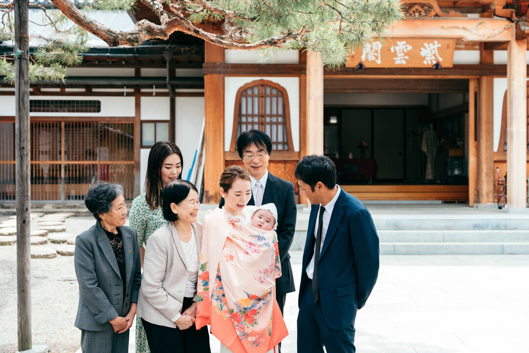 • ご用意いただいた産着を着て 撮影スタート。 ご家族の集合写真を撮影します。